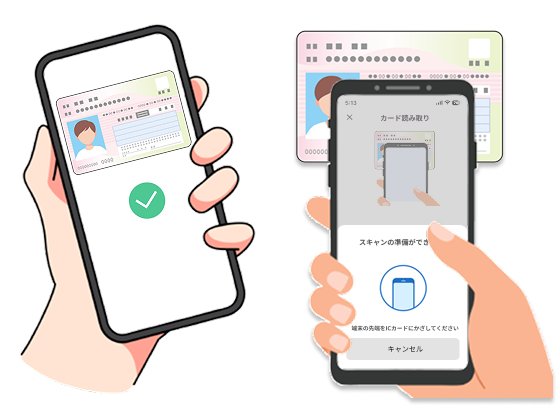 スマートフォンでのJPKI(公的個人認証)、ICチップ付き本人確認書類の読取、マイナ免許証読取※にも対応しています。※今後対応予定